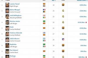 西甲最新身价前十:亚姆贝前三维尼修斯仍第四,佩德里1.4亿第五